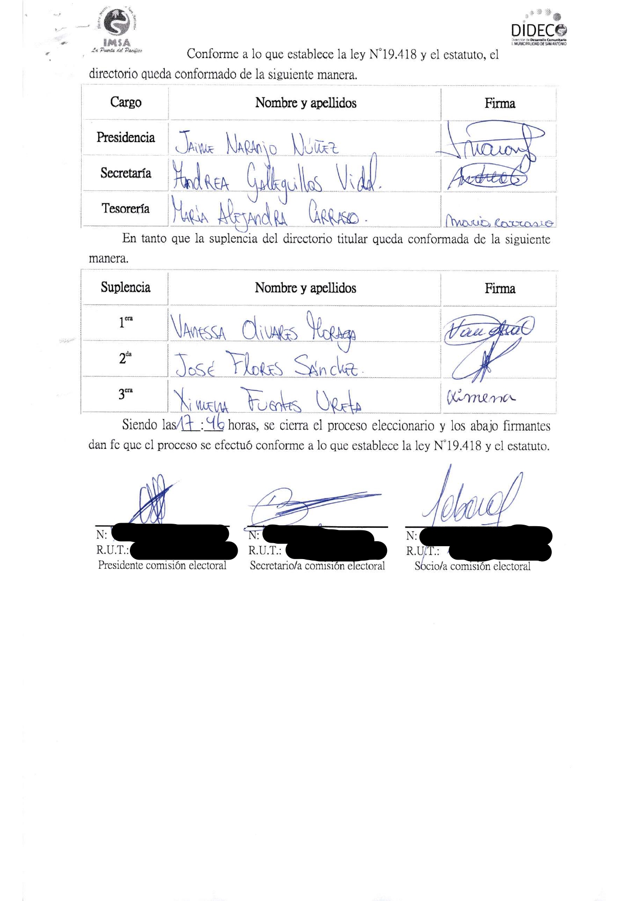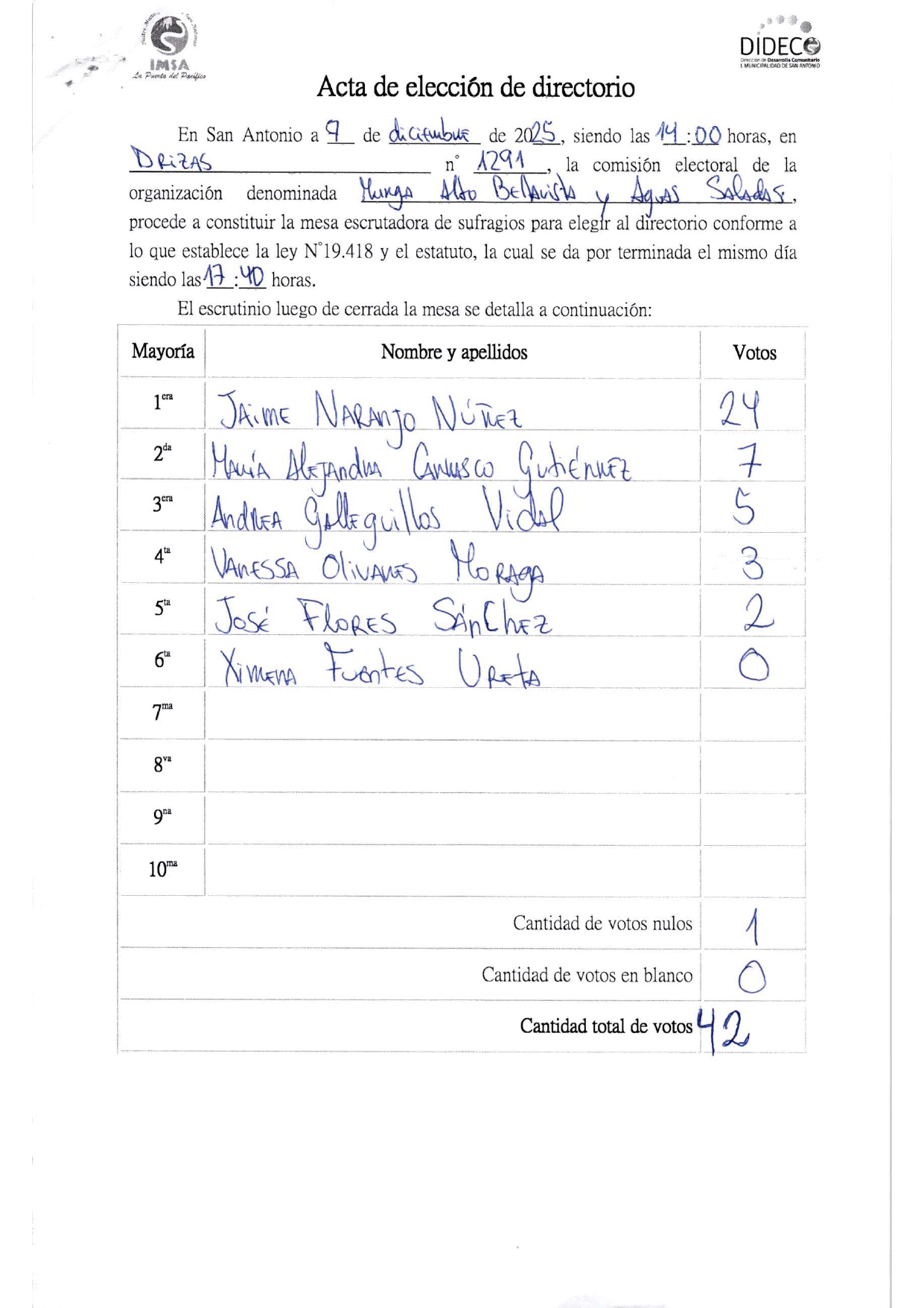Acta de elecciones MURGAS Y COMPARSAS ALTO BELLAVISTA AGUAS SALADAS