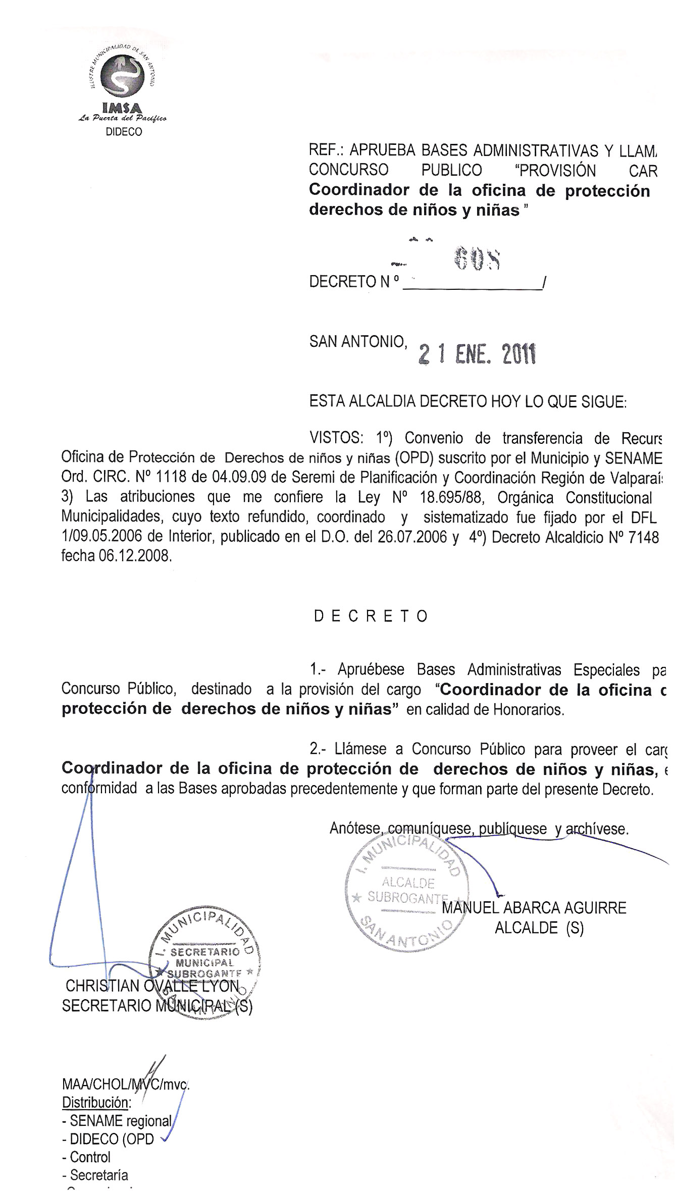 La Ilustre Municipalidad de San Antonio llama a Concurso Público de Antecedentes para proveer en calidad honorarios el cargo de Coordinador de la oficina de protección de derechos de niños y niñas, dependiente de la Dirección de desarrollo Comunitario, la cual cuenta con financiamiento compartido entre SENAME y el Municipio.